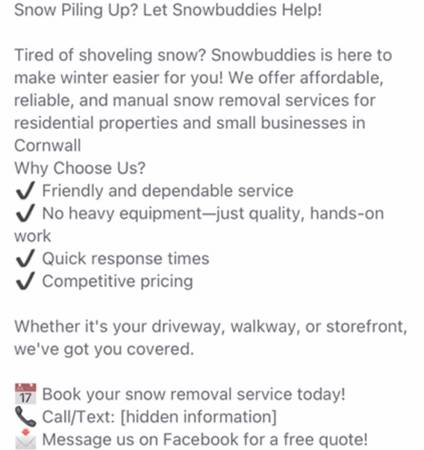Hi there im offering a snow cleaning service thats afirdable and is done quickly. Messege me on Facebook or call me at if you are interested in your driveway and/or you walkway